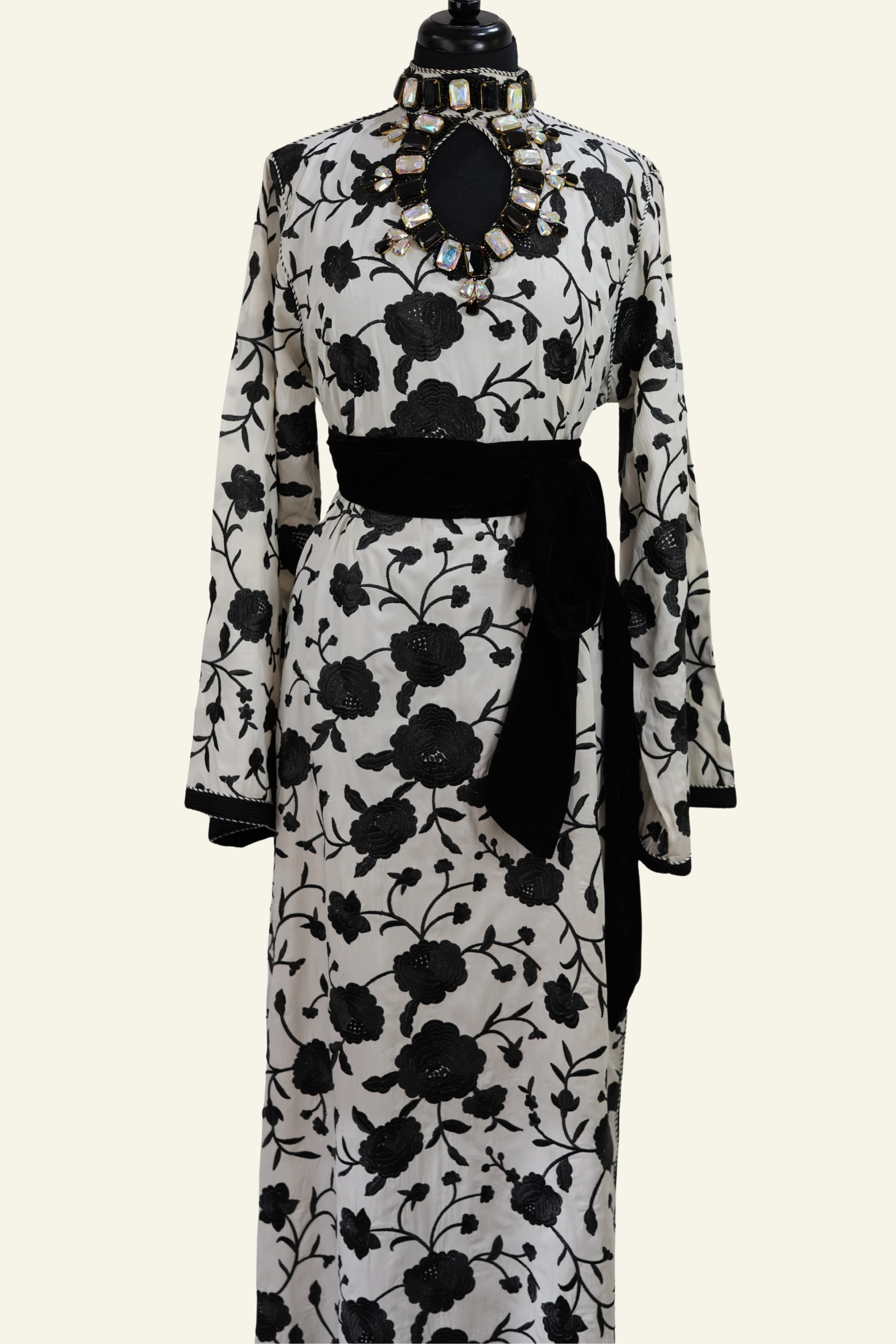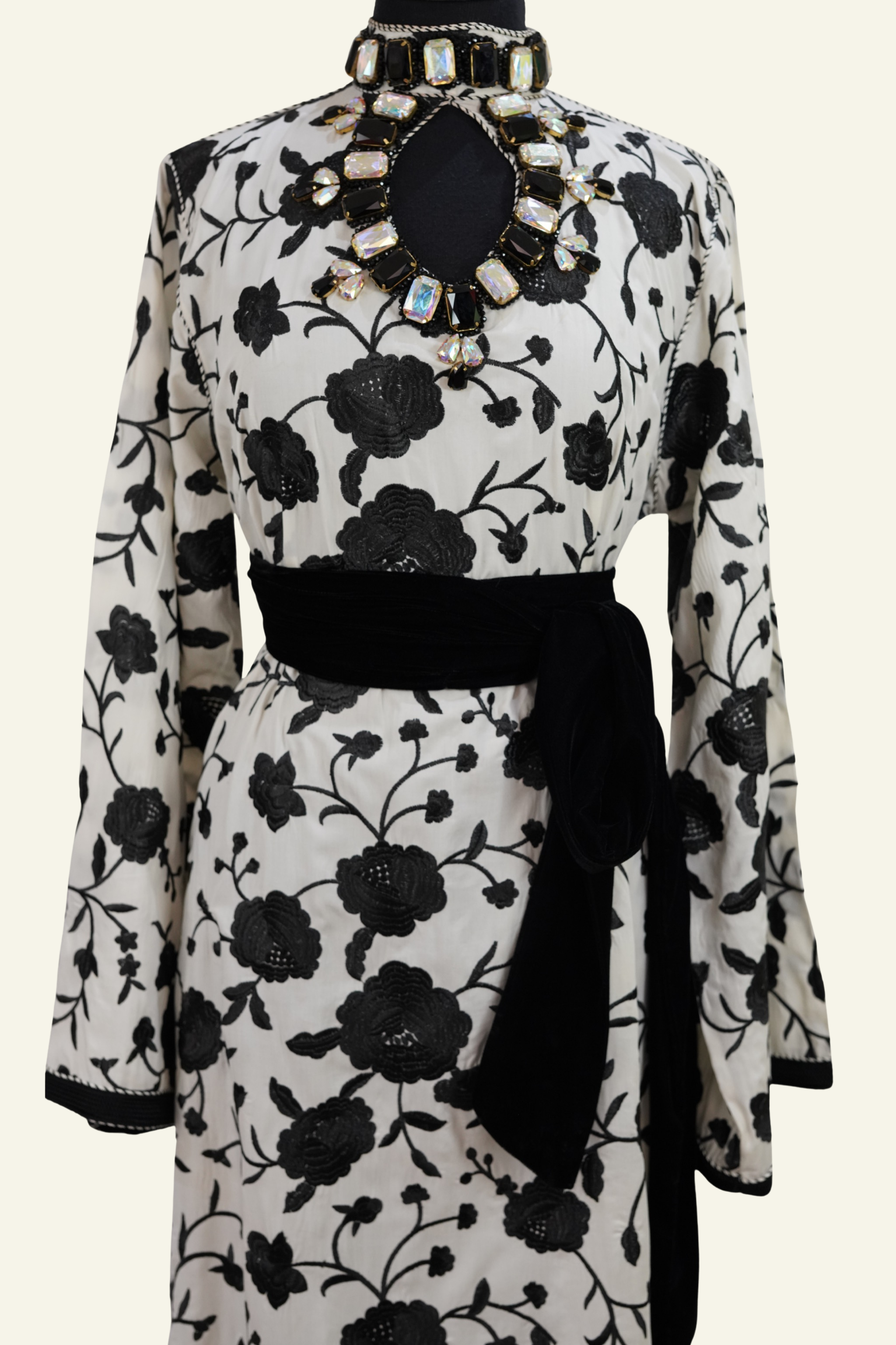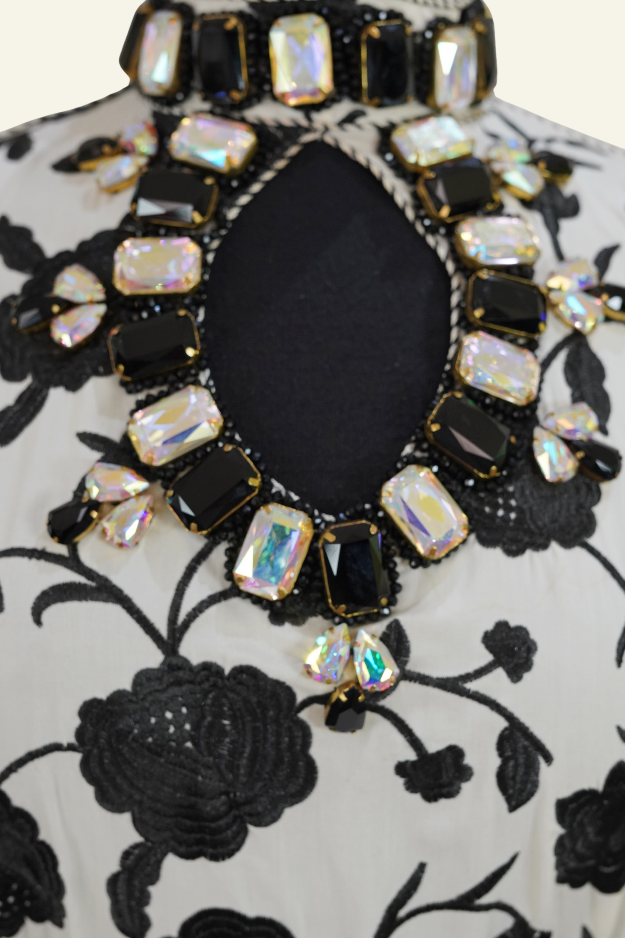 NOIR : Robe en taffetas brodé. Col orné de bijoux et ceinture noir.