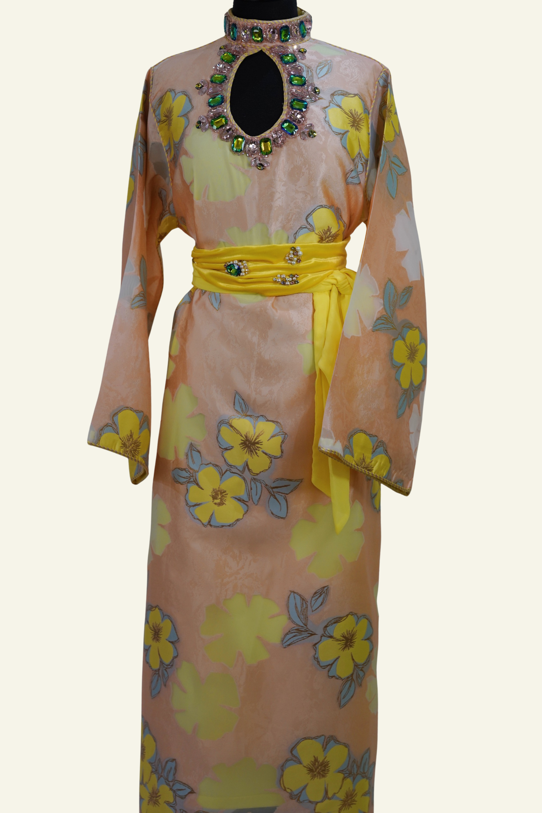 ROSE : Robe en taffetas brodé. Col orné de bijoux et ceinture jaune orné.