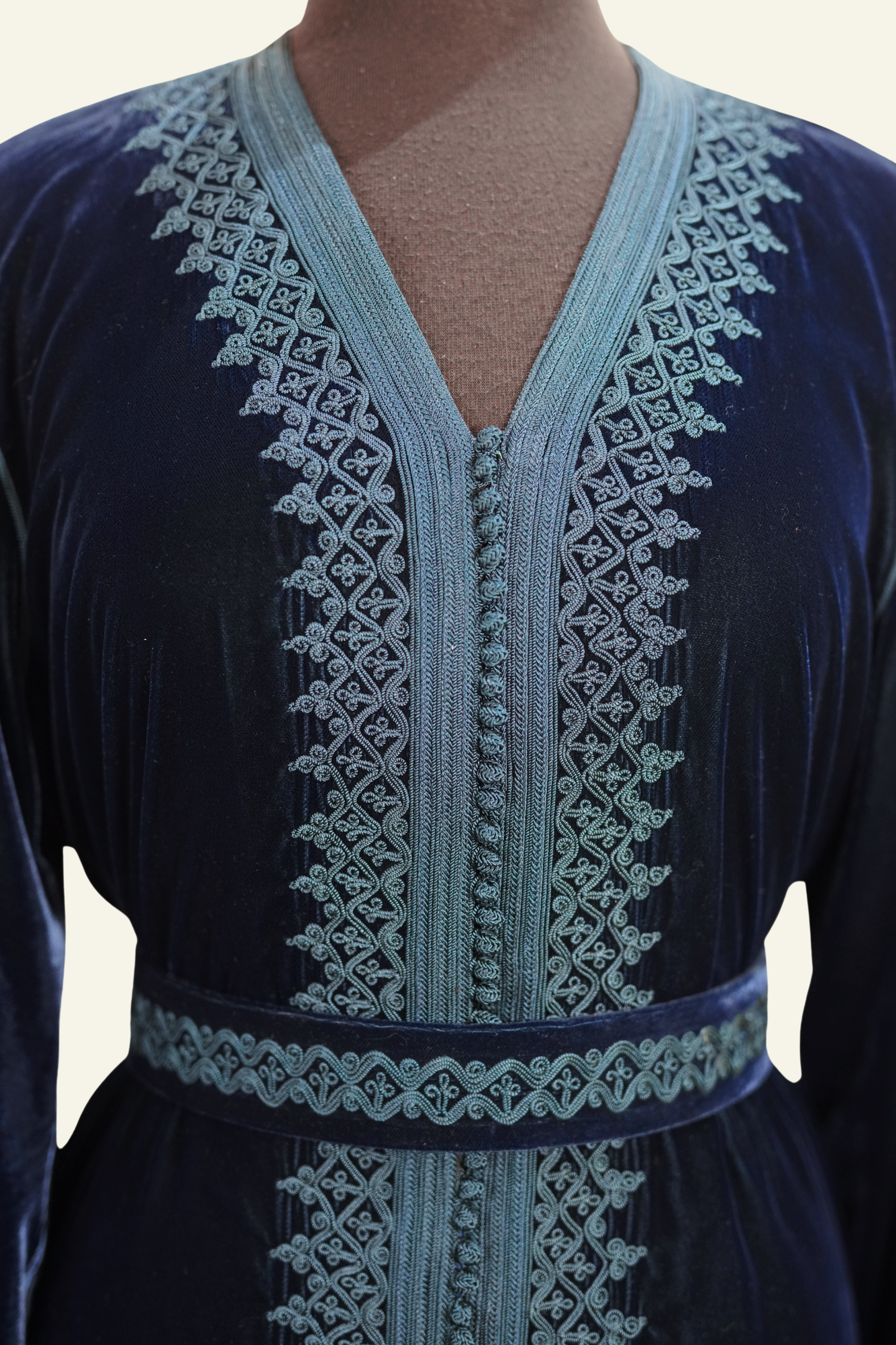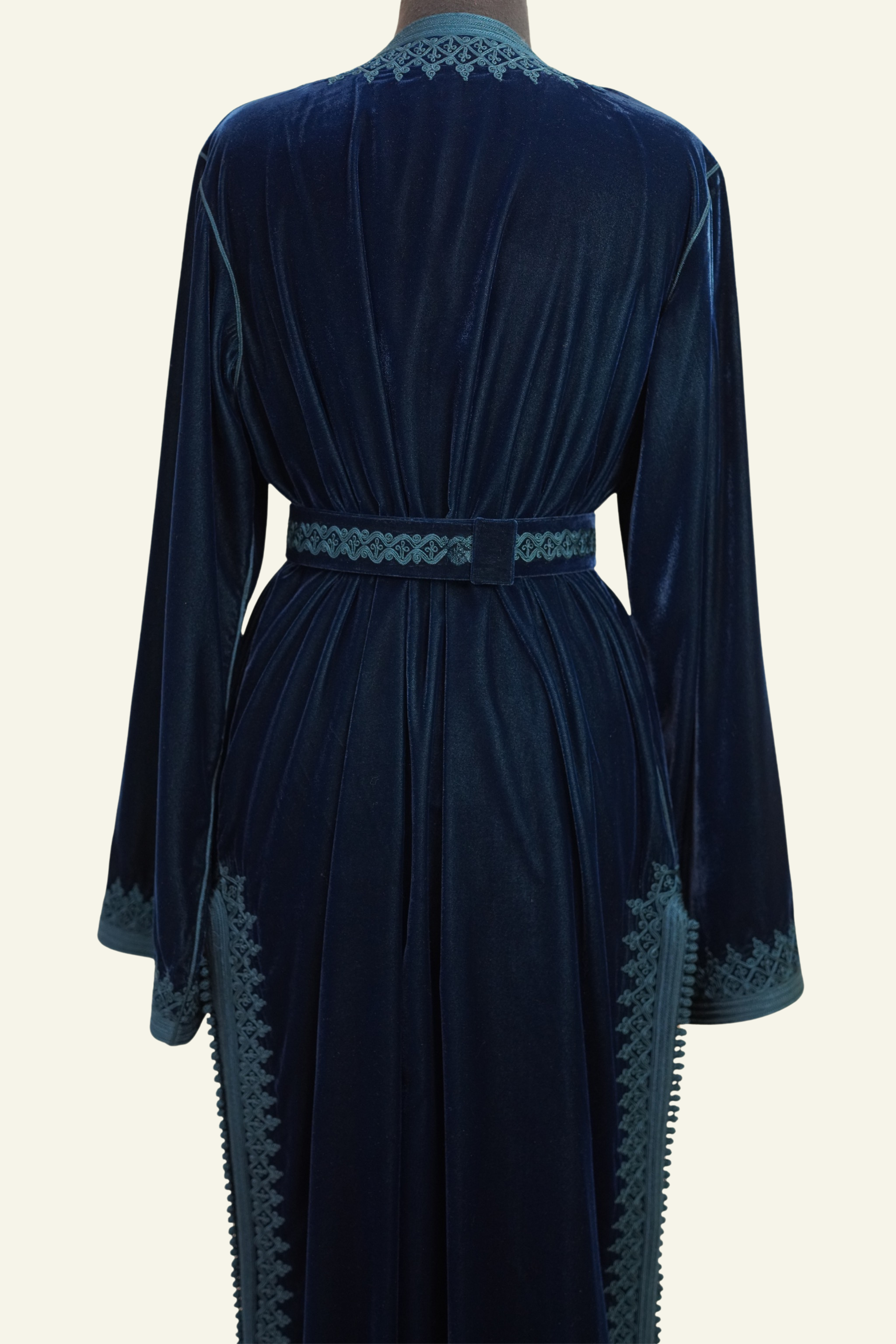 Caftan en velours de soie bleu pétrole travaillée ton sur ton en maâlem et zwak.